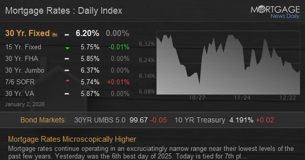 Mortgage rates continue operating in an excruciatingly narrow range near their lowest levels of the past few years. Yesterday was the 6th best day of 2025. Today is tied for 7th place after rates moved 0.01% higher on average.