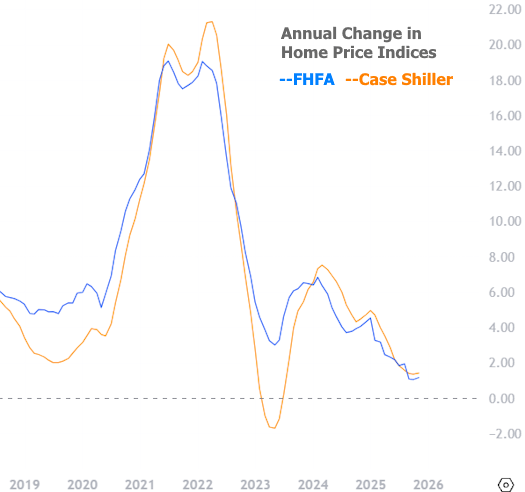 Both the FHFA and the S&P/Cotality Case-Shiller home price indices released November data this week, and the combined message is that home price appreciation continues doing better than it had been in the middle of 2025.