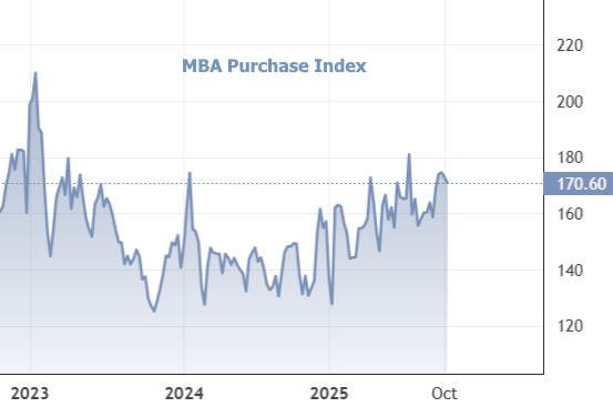 The Refinance Index decreased 8% from the previous week but remains 18% higher than the same week one year ago. Refinancing activity pulled back broadly across conventional and VA segments after climbing to multi-year highs in September. This is a logical move considering rates were at long-term lows in mid-September and then rose sharply to the present range on September 17/18.