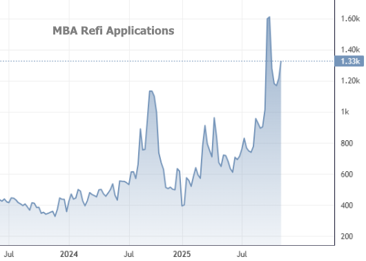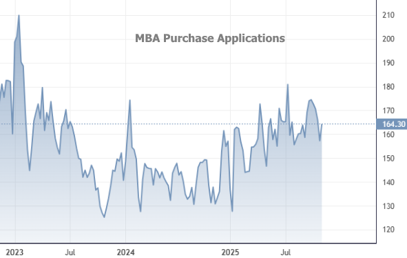 Purchase applications rose 5% on a seasonally adjusted basis and 4% unadjusted, climbing 20% above the same week one year ago. Activity continues to improve versus 2024’s subdued levels, aided by easing rates and slightly better inventory conditions.