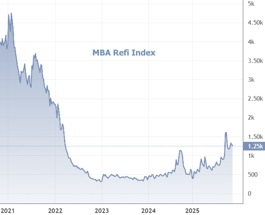 Viewed in context, refi demand is still well into post-2020 recovery territory, even if weekly swings look choppy.