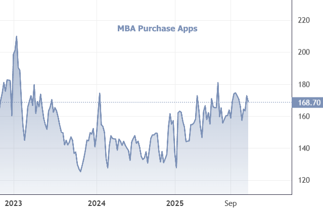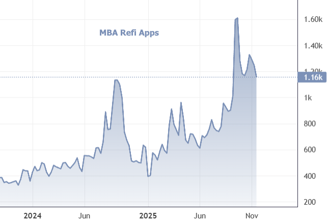 After hovering near one-year lows in late October and early November, mortgage rates have pushed modestly higher as Treasury yields recalibrated. Even so, rates remain well below their 2023 highs, helping preserve the substantial year-over-year lift in both purchase and refinance activity.